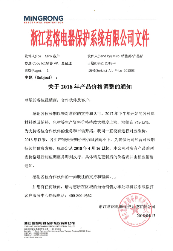 關(guān)于調(diào)整浙江茗熔電器保護系統(tǒng)有限公司產(chǎn)品售價的通知