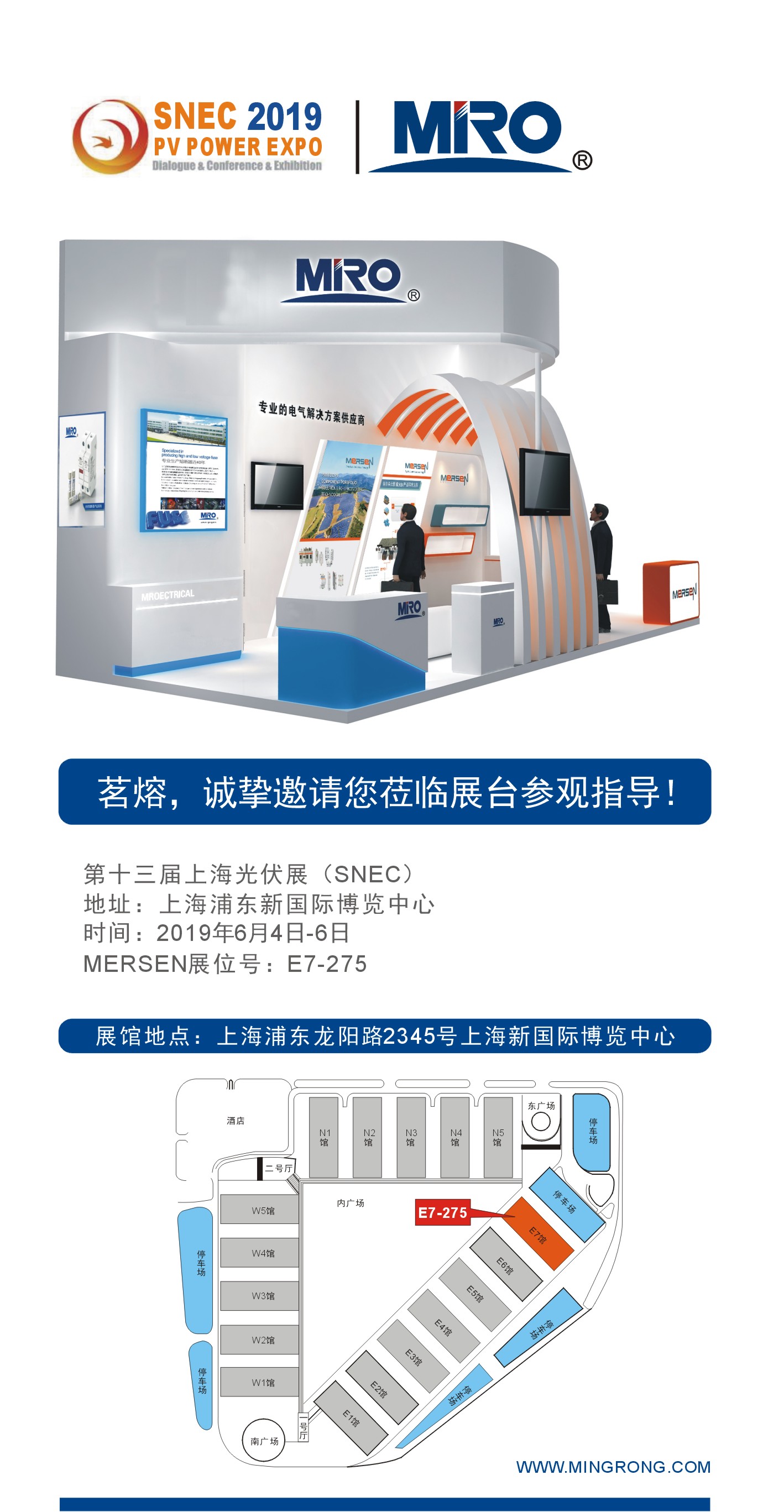 茗熔電器保護系統(tǒng)有限公司將于2019年6月4-6日,參加SNEC第十三屆(上海)國際太陽能產(chǎn)業(yè)及光伏工程(上海)展覽暨會議,展位號E7-275。參展產(chǎn)品為光伏熔斷器產(chǎn)品。屆時歡迎各界客商蒞臨參觀洽談。