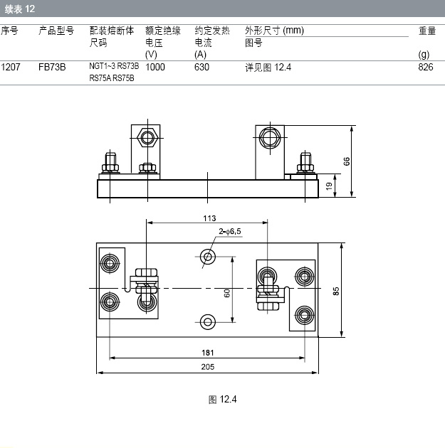 此類熔斷器底座有兩種結(jié)構(gòu):一種由載熔件和支持件/底座 組成( 圖12.1),配裝的螺栓連接式熔斷體先固定在載熔件上,再 插入支持件/ 底座的靜觸頭上形成一個完整的熔斷器;另一種不 帶載熔件,將配裝的螺栓連接式熔斷體直接用螺栓緊固在底座的 靜觸頭上。根據(jù)用戶需要,本公司還承制其他型式的非標熔斷器 底座。